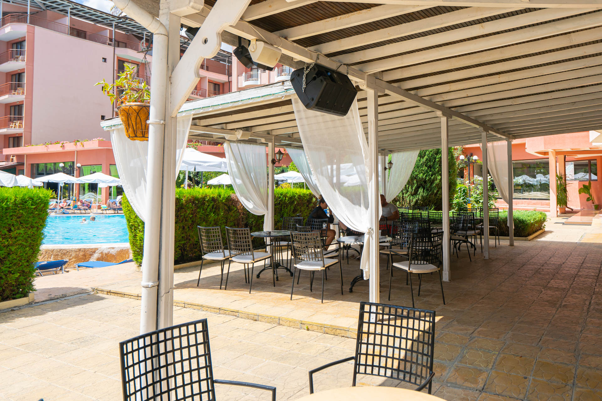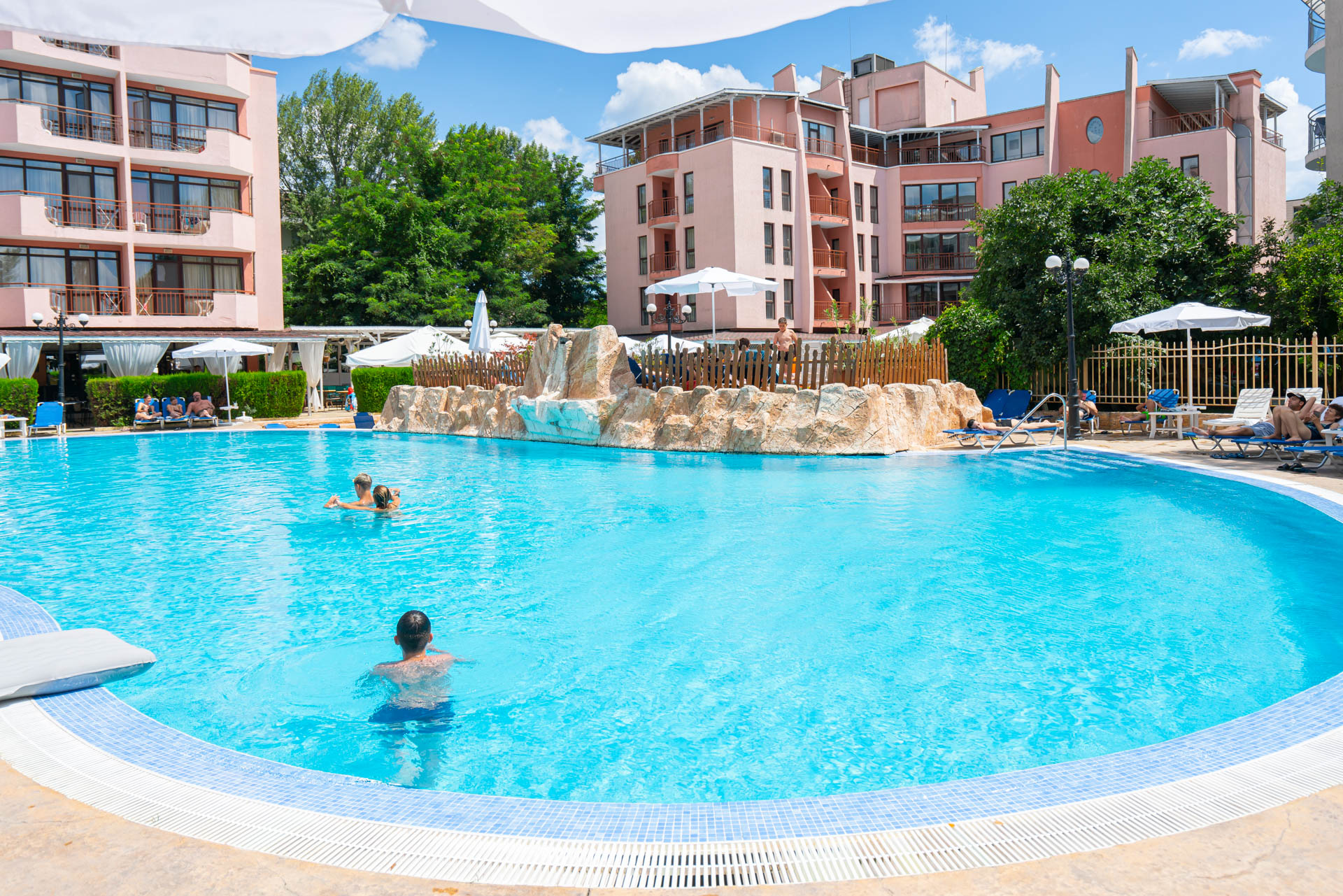 Hotellet har et stort poolområde med liggestole, parasoller og en poolbar, hvor du kan nyde kolde drikke og snacks i løbet af dagen. Stemningen er afslappet og livlig, og her samles gæsterne for at nyde solen og skabe ferieminder sammen. Der er også en hyggelig lobbybar og et mindre fitnessrum til dig, der gerne vil holde formen ved lige under ferien.